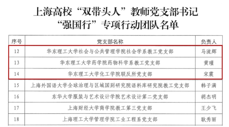 近日,上海市教卫工作党委公布了上海高校“双带头人”教师党支部书记“强国行”专项行动(以下简称“强国行”专项行动)团队名单,评选出42个上海高校“双带头人”教师党支部书记“强国行”专项行动团队,我校社会与公共管理学院社会学系教工党支部、药学院药物科学系教工党支部、化工学院联反所党支部3个成功入选。